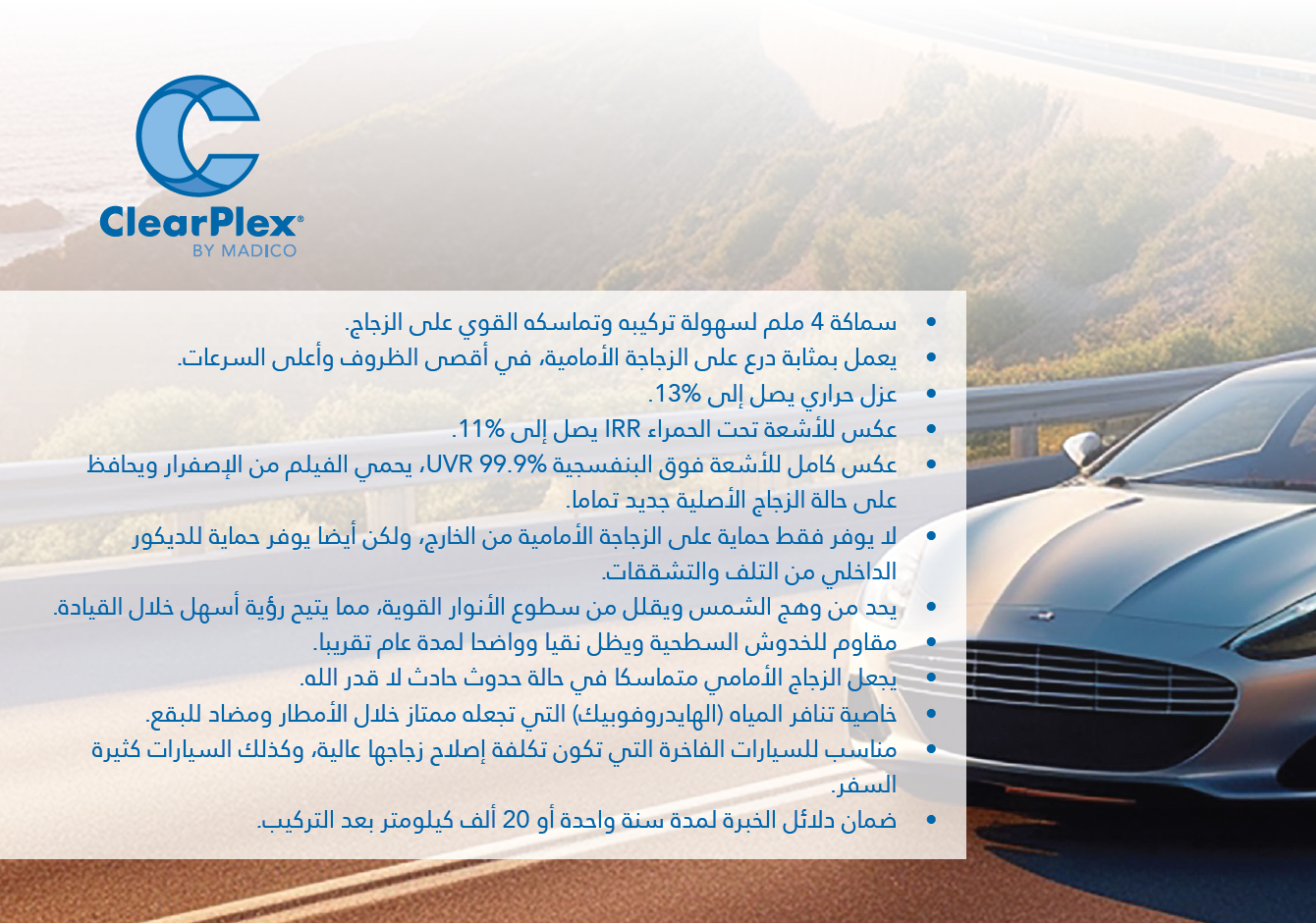 يحمي كليربلكس ClearPlex الزجاج الأمامي للسيارة من الحصى والحفر وتأثير سرعة الطريق على نقاء وصفاء الزجاج الأمامي، مما يحافظ عليه ويبقيه دائما في حالته الأصلية.